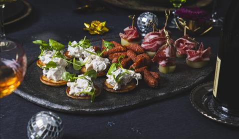 Nyd slagterens snackpølser, som fungerer som en hurtig og smagfuld snack, lavet med kærlighed. Dernæst følger en lækker coppa på en bund af syltede grønne tomater og blinis med cremet kyllingesalat. En smagfuld start på en fantastisk aften.