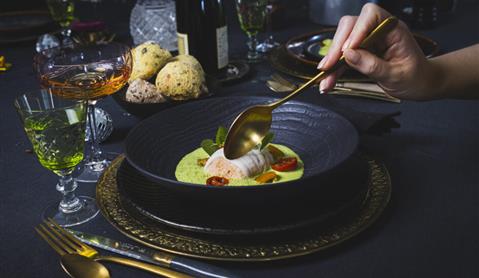 Aftenens forret byder på en elegant paupiette af frisk Vesterhavsfisk i en skøn og skummende basilikumssauce, det let løfter retten og tilføjer en frisk og aromatisk dybde. Forretten toppes med semi-dried tomater og frisk brøndkarse. Hertil stenovnsbagt kuvertbrød.