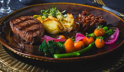 Til hovedret har vi sammensat en menu, hvor klassisk elegance møder rustik velsmag. Sæt tænderne i slagterens møre rosa stegte oksemørbrad, der omsluttes af en fyldig og afrundet sherrysauce. Ved siden af en saftig og langtidsstegt nakkefilet, drysset med en sprød og saltet baconcrust, der giver kant og karakter. Hertil serveres asparges broccolini og smørmøre pariser karotter, i selskab med syltede løg, og en klassisk fransk Pommes Annette.