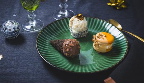 Derfor afsluttes menuen med tre små og delikate fristelser. Nyd en sprød mini kakao vaffel som gemmer på en fyldig cremet chokoladeoplevelse inspireret af den klassiske Ferrero Rocher. Herefter følger en elegant macaron med blød saltet karamel, og sidst en frisk og eksotisk kokosvaffel fyldt med syrlig passion og havtorn.